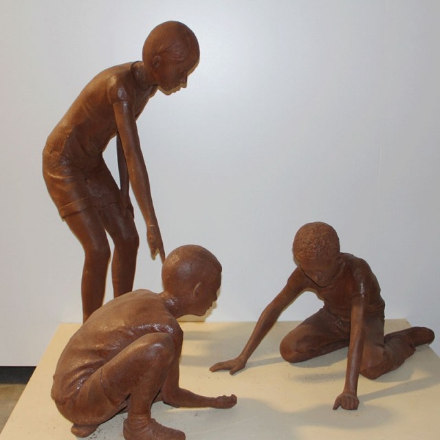 Skap en leken og nostalgisk atmosfære med denne sjarmerende bronse-skulpturen av tre barn som sitter sammen, dypt konsentrert om et klinkekulespill. Skulpturen fanger barndommens enkle gleder og fellesskap, hvor samspillet og entusiasmen stråler gjennom barnas livfulle holdninger og detaljerte ansiktsuttrykk. Med realistiske detaljer som klærnes små folder og den intense fokuseringen hos barna, vekker skulpturen minner om tidløs lek og samvær.