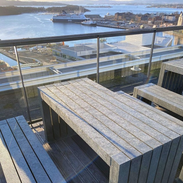 Stilren benk og bord som er produsert utelukkendes av plastavfall og er igjen 100% resirkulerbart. Se video