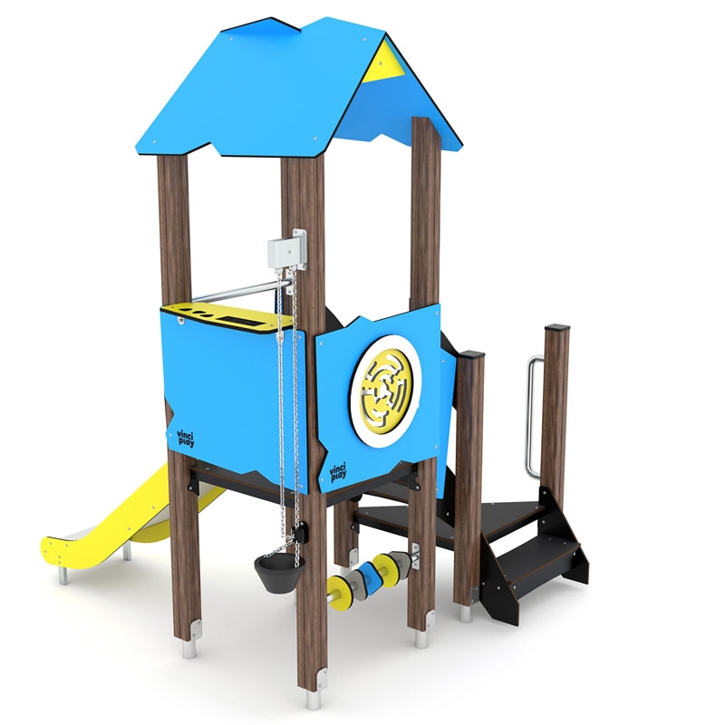 Tårn sklie og sanse opplevelser for de mindre barna i serien Wooden som er flotte klassiske lekeapparater med smarte løsninger og fokus på universell utforming.