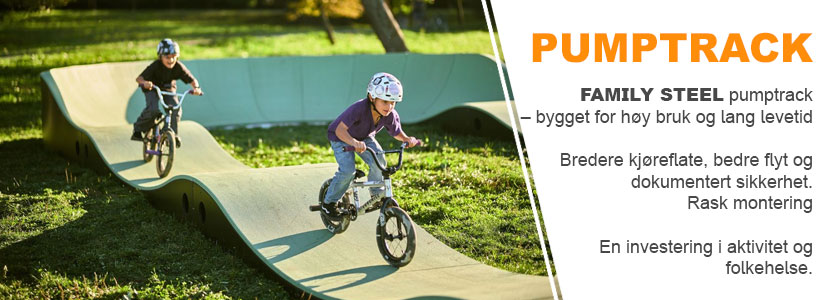 Family Steel pumptrack er en modulbasert pumptrack bane med stålramme og kompositt kjøreflate. Perfekt for park, skole og nærmiljøanlegg. Gir aktivitet, mestring og trening for alle aldre – med minimalt vedlikehold og dokumentert kvalitet.