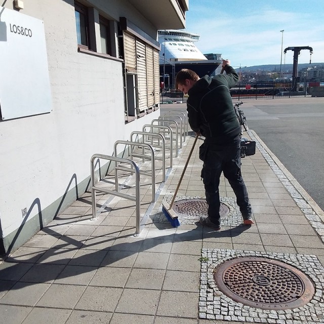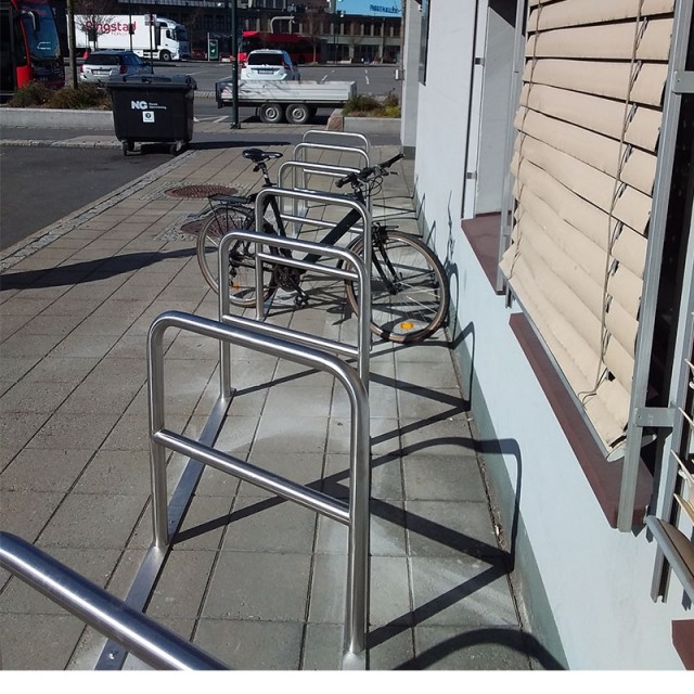 Sykkelstativ galvanisert og lakkerte bøyler for overflatemontering på skinne. 2 sykler pr bøyle. Pris for 6 sykler. Kan forlenges med ønsket antall bøyler