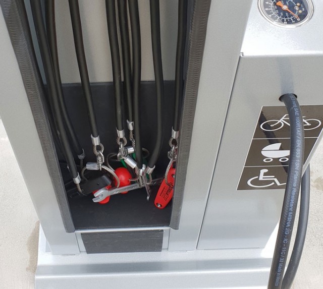 Stort offentlig sykkelverksted med sykkelpumpe, med mulighet å henge opp sykkelen