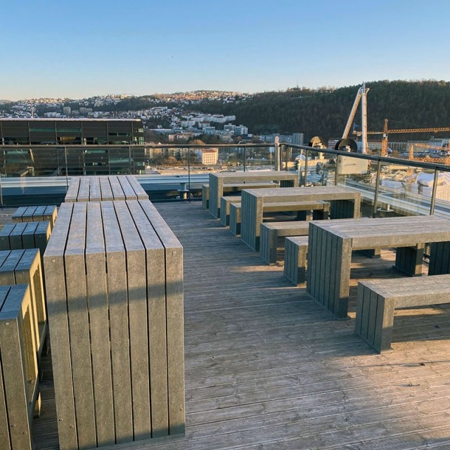 Stilren benk og bord som er produsert utelukkendes av plastavfall og er igjen 100% resirkulerbart. Se video